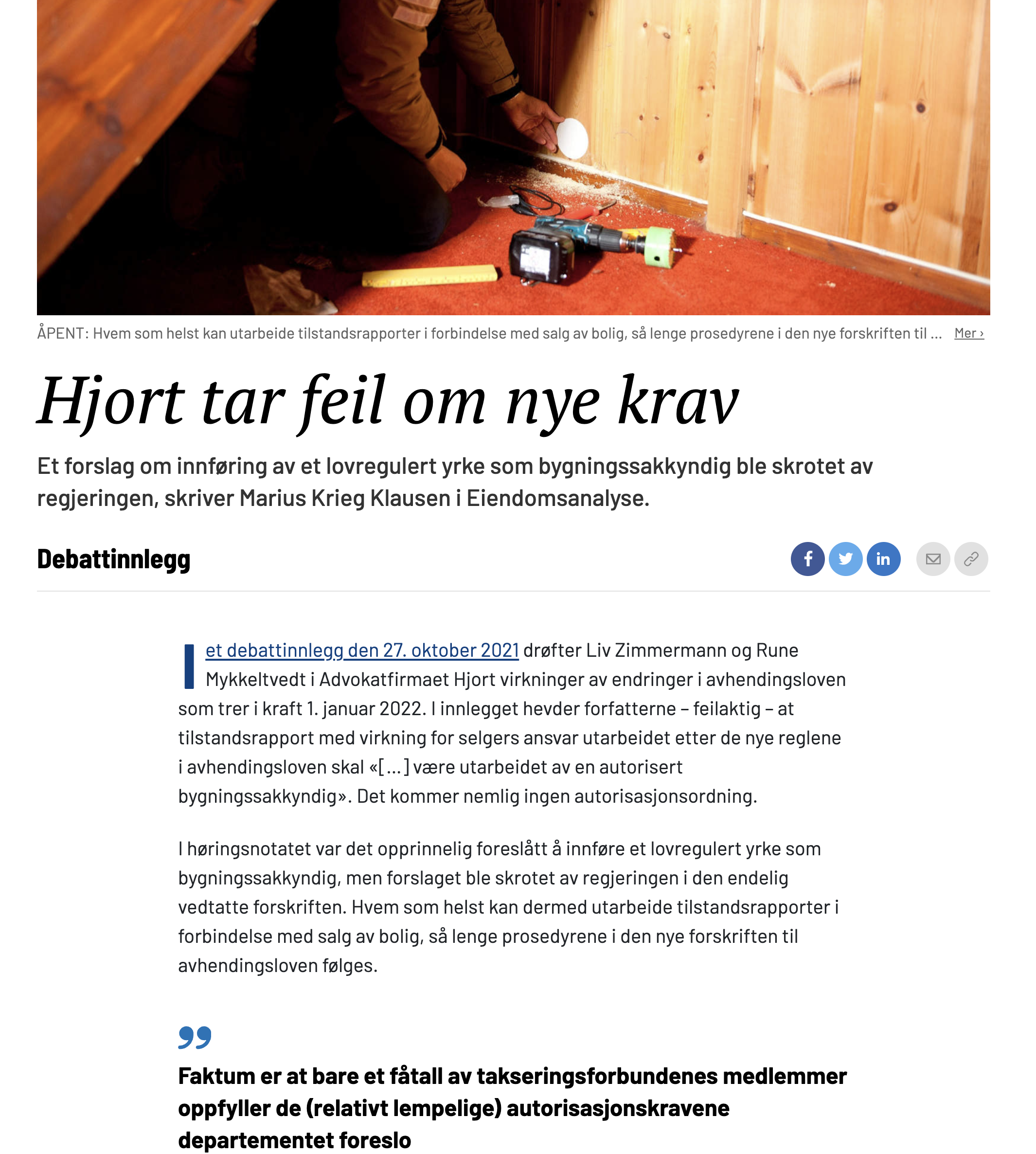 Et forslag om innføring av et lovregulert yrke som bygningssakkyndig ble skrotet av regjeringen, skriver Marius Krieg Klausen i Eiendomsanalyse i Finansavisen 29. oktober 2021. Dette innlegget er gjengitt etter samtykke fra ingeniør Marius Krieg Klausen i Eiendomsanalyse AS.